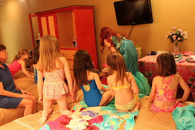 Eight little girls are taken by surprise, when "the real" Ariel walks through the doors to the pool!!! Kayli reacts like the character whose eyes pop out, and jaw drops down, then she falls to the floor "in shock"! (No I did not get this on video,it all happened so fast!) Then, back on her feet, she motions for me to come closer as she cups her hand and loudly "whispers" "Mom, why did Ariel come to my birthday?" She is still in disbelief. Ariel came in and helped with presents, cake, and posed for pictures with each little girl. Then, with everyone ready to swim, I asked the girls if they thought it would be fun to turn Ariel into a human so she could stay and swim with us. Unanimously we decided to use the magic wand, while saying the special magic words, that I just happened to know, and Ariel disappeared into the room for a few minutes, and returned with human legs, ready to swim! Everyon kept telling her how much they loved her, and that she was their favorite princess EVER! Before leaving, Ariel gave each little girl a bright purple plastic "dinglehopper/fork" to have as their very own keepsake. I overheard two little girls talking, one said to the other "Did Ariel just give us a REAL dinglehopper?" Other girl yells to Ariel "Ariel, is this a REAL dinglehopper?" "Why of course" is the reply, and the two little girls turn to each other and nod their heads in solid confirmation of the information they were just given!