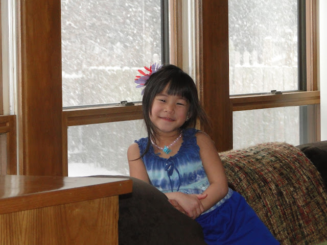 Kayli says "Wow, Mom, it sure is foggy out!" Well, not exactly, Kayli, this is what we call a blizzard. Kayli was dying to get out and check this out, so I decided we would take a walk to the mailbox on our corner. The snow was blowing at us so hard that we couldn't see where we were going. Made me think about the "Little House on the Prairie" stories! Kayli "tried" to play, but quickly announced "This is not good playin' weather, Mom, it's hurting my eyes." Today was definitely a day to stay inside and watch it snow, and snow, and snow, and...